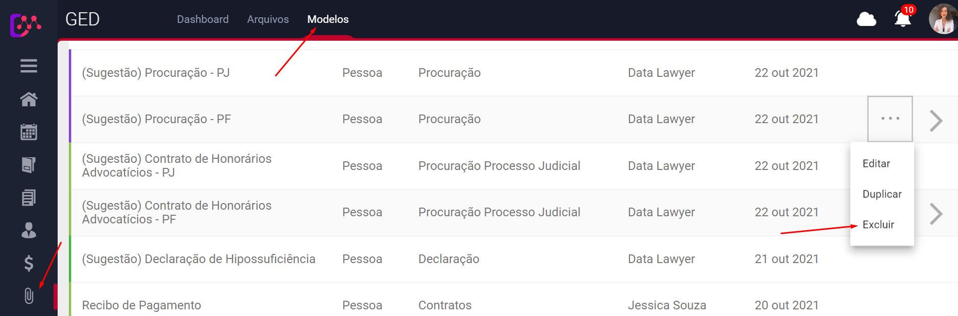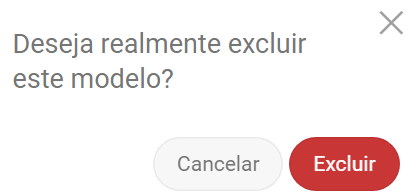 Para excluir um modelo de documento clique no módulo GED > Modelos > posicione o mouse por cima do modelo > selecione o ícone