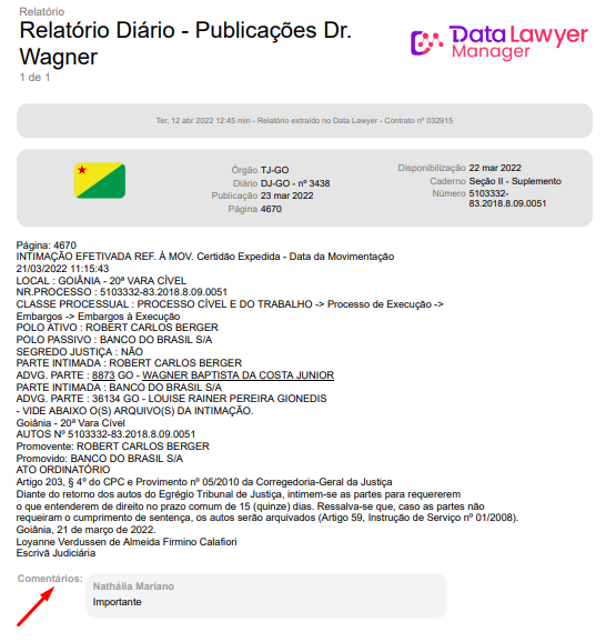 Selecione a opção Incluir comentários se deseja que no relatório sejam exibidos os comentários inseridos nas publicações. A visão do seu relatório em pdf será esta: