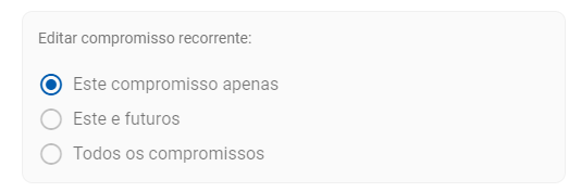 Ao editar um compromisso que foi criado (utilizando a opção repetir), as seguintes opções são exibidas no momento da edição: