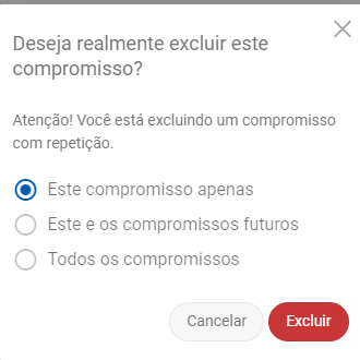 Ao excluir um compromisso que foi criado (utilizando a opção repetir), as seguintes opções são exibidas no momento da exclusão: