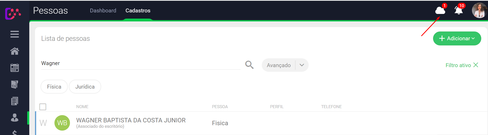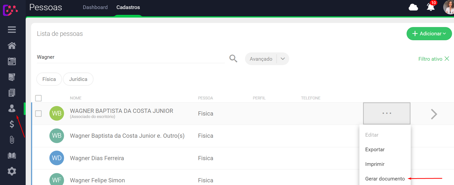 Caso queira gerar um documento utilizando dados de uma pessoa (exemplo: procuração, declaração, contrato de honorários, entre outros), clique no módulo Pessoas > Cadastro e escolha uma pessoa.
