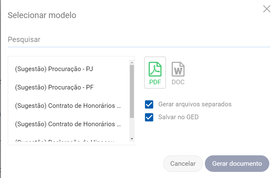 Selecione o modelo de documento e selecione o formato (PDF ou DOC).