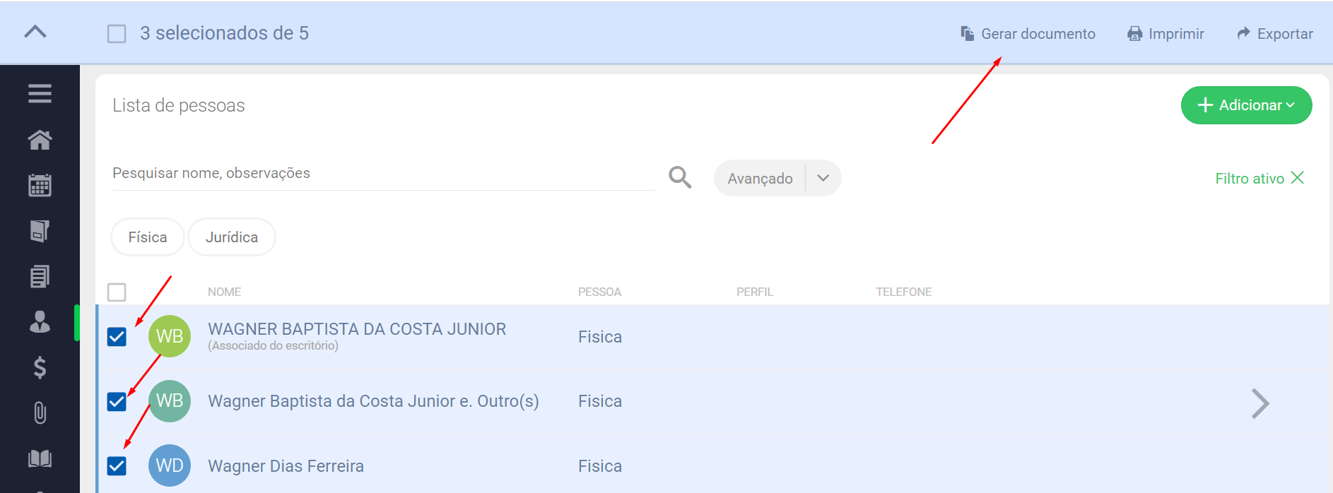 Caso você queira gerar documentos em lote, selecione as pessoas e clique em Gerar documento: