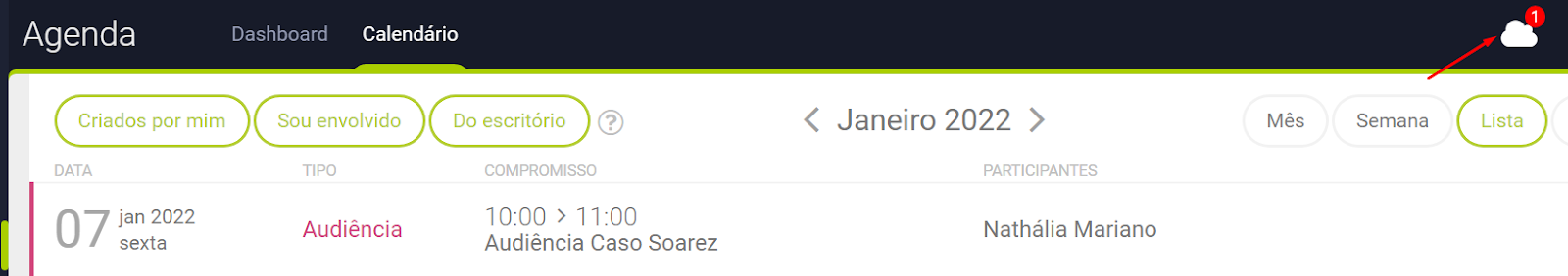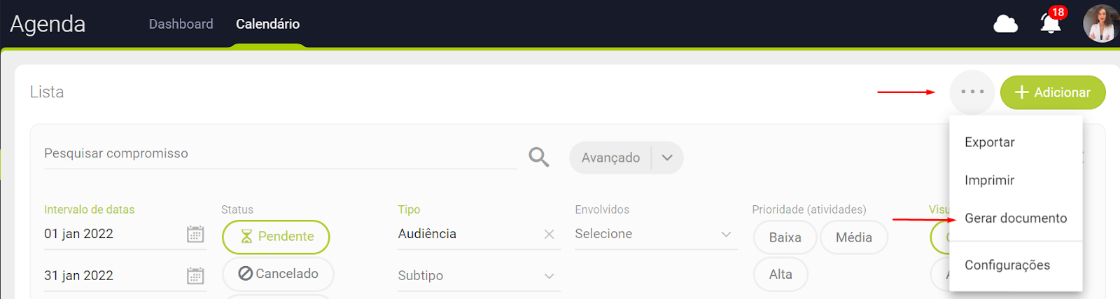 Caso queira gerar um documento utilizando dados do módulo Agenda (exemplo: pauta de audiência, relatórios e etc), clique no módulo Agenda > Calendário e realize um filtro.