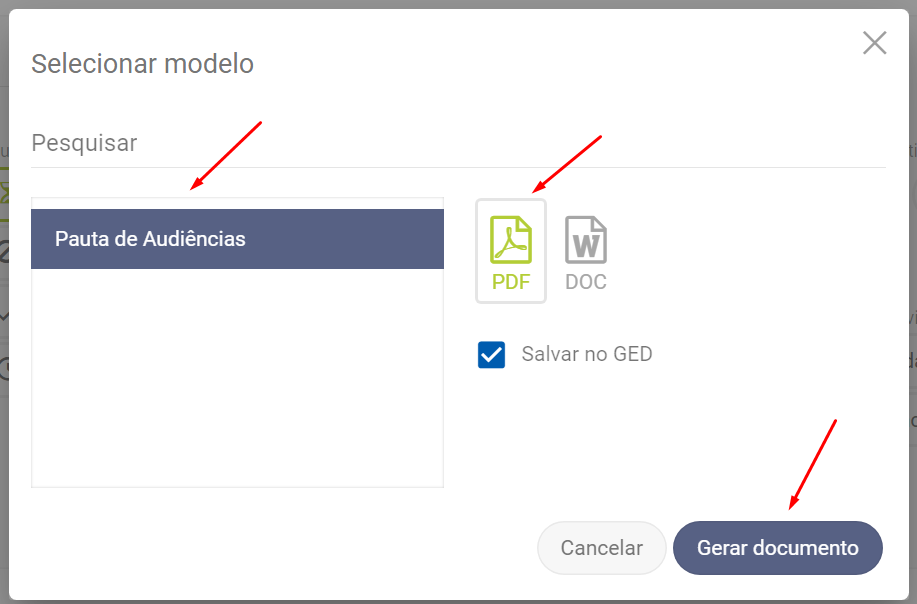 Selecione o modelo de documento e selecione o formato (PDF ou DOC).