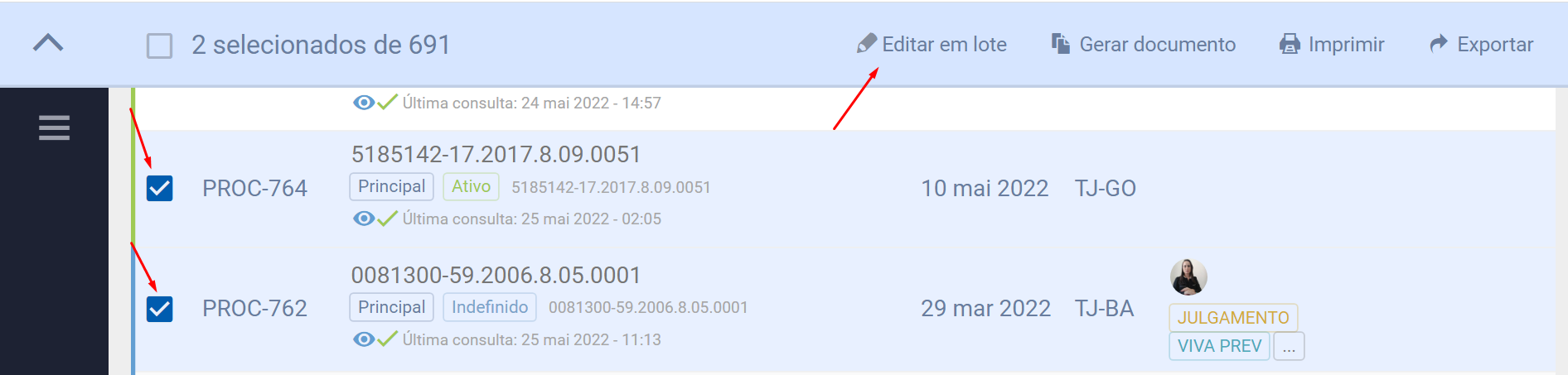Selecione os processos desejados e no menu superior, clique em Editar em lote: