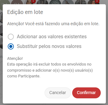 b) Substituir pelos novos valores: Você irá substituir todos os envolvidos nos compromissos pelos novos, na modalidade que tiver configurado: Participante, Responsável, Solicitante.
