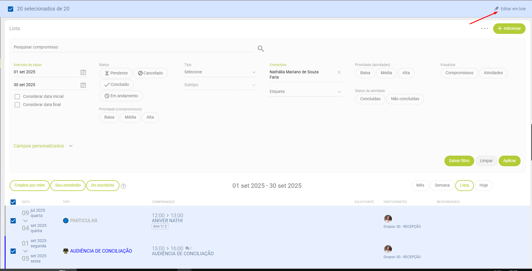Ao clicar sobre Editar em lote, exibirá as opções: Adicionar envolvido em compromissos e Substituir responsável em atividades.
