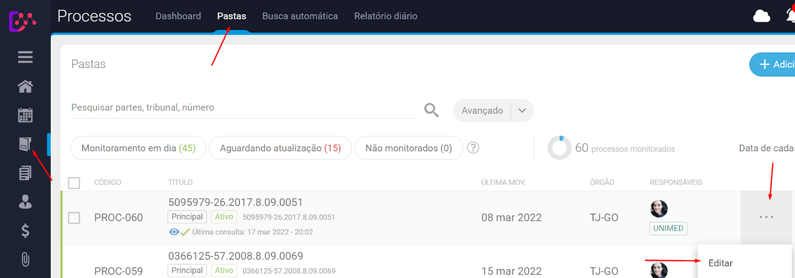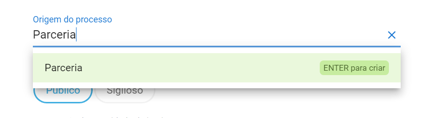 Como incluir mais tipos no campo Origem? Para acessar vá no módulo Processos > Pastas > posicione o mouse sobre o processo e clique nos três pontos > Editar. Selecione Mais: Desça a página até encontrar o campo Origem do processo, digite o texto e dê Enter para criar o novo tipo de origem.