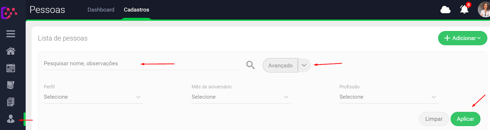 1º Digite no campo “Pesquisar nome, observações” o nome da pessoa/sobrenome e clique na lupa.
