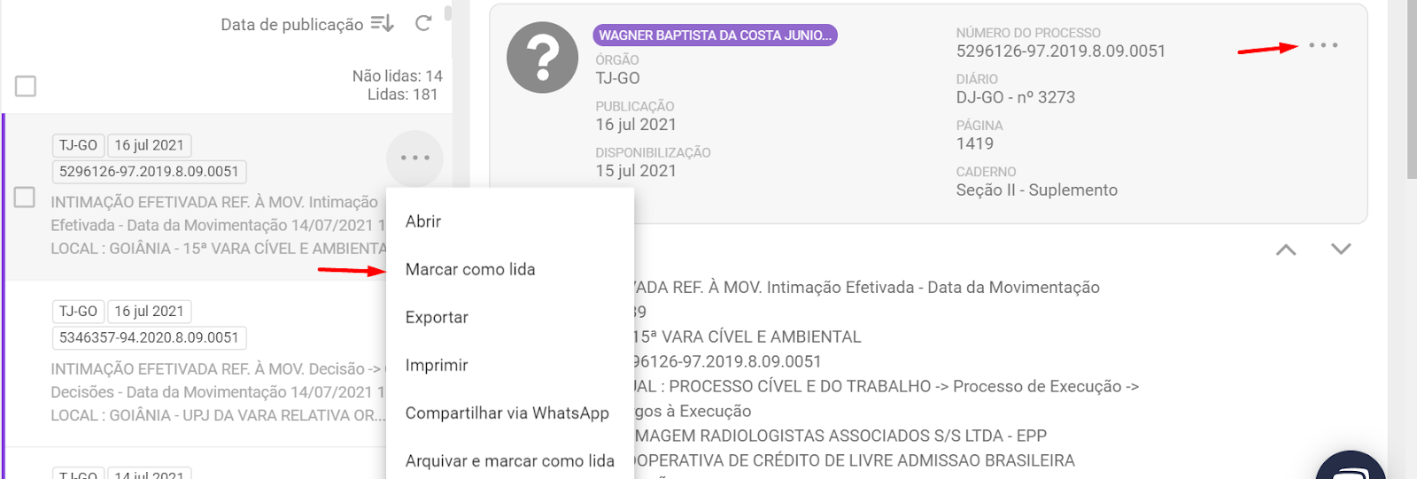 Como marcar publicações como lida? Para marcar uma publicação como lida, vá no módulo Publicações > posicione o mouse por cima da publicação > clique no ícone > Marcar como lida. A publicação lida fica assinalada com o símbolo do “check” .