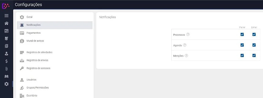 *Para que as notificações ocorram, certifique-se que seu usuário está habilitado para receber menções por painel e por e-mail, para isso vá em Configurações > Notificações: