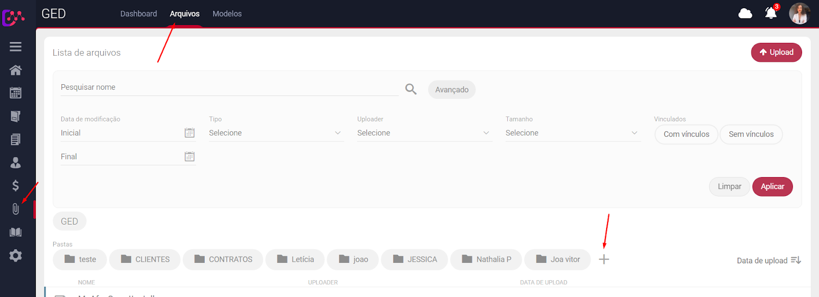 Como organizar meus arquivos em pastas? Para organizar os arquivos em pastas no GED, vá na aba Arquivos e selecione o “+” para criar a pasta. Defina o nome da pasta e clique no ícone .