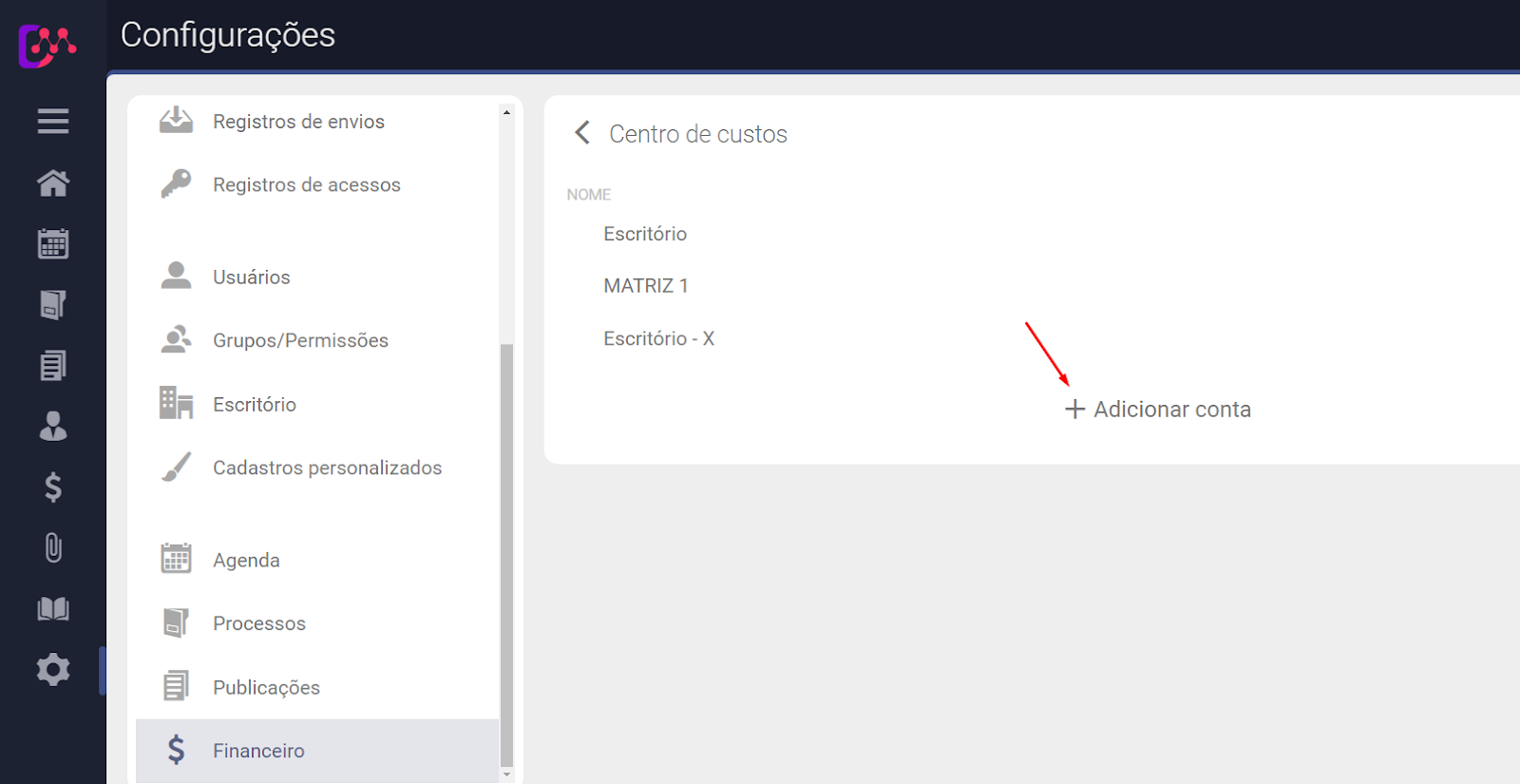 Como incluir/alterar/excluir um centro de custos? Para criar um lançamento no financeiro é obrigatório que exista um centro de custos cadastrado.Para adicionar um centro de custos, vá em Configurações > Financeiro > Centro de custos e vá em +Adicionar conta. Insira o nome desejado e marque o status desejado: Por fim, clique em Salvar.