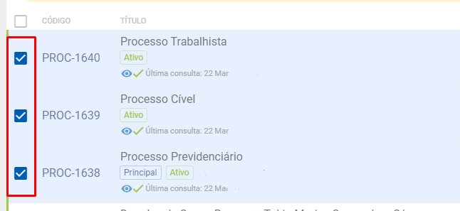 Outra forma de parar o monitoramento, é fazendo o procedimento em lote. Vá até as pastas de processo, e então selecione as pastas que deseja, na caixa de seleção:
