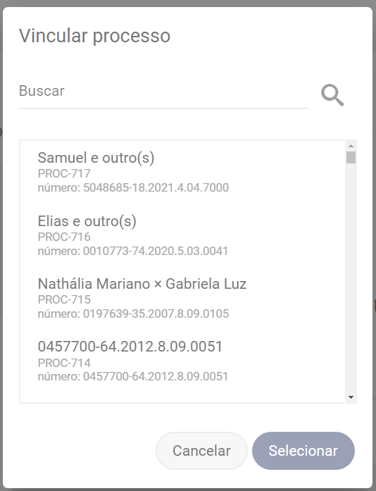 Uma nova janela será exibida, escolha o processo que queira vincular > clique nele e por fim em +Selecionar.