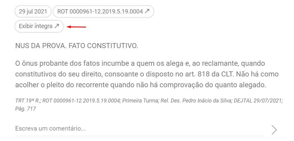 Como visualizar a íntegra de um julgado? Para visualizar a íntegra de um julgado, vá no módulo Acervo Jurídico > Jurisprudência e clique em Exibir íntegra logo acima da ementa.