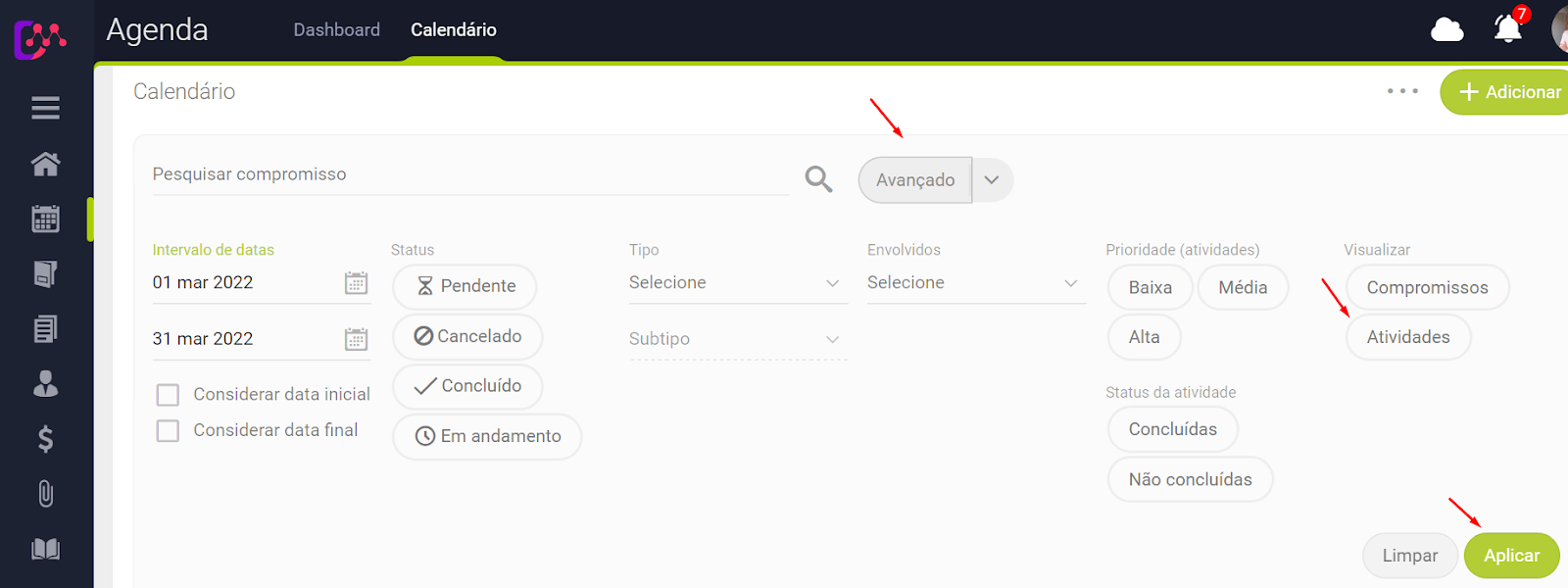 Para visualizar apenas atividades no calendário é necessário realizar um filtro. Para isso clique em Agenda > Calendário > Avançado > Visualizar atividades > Aplicar.
