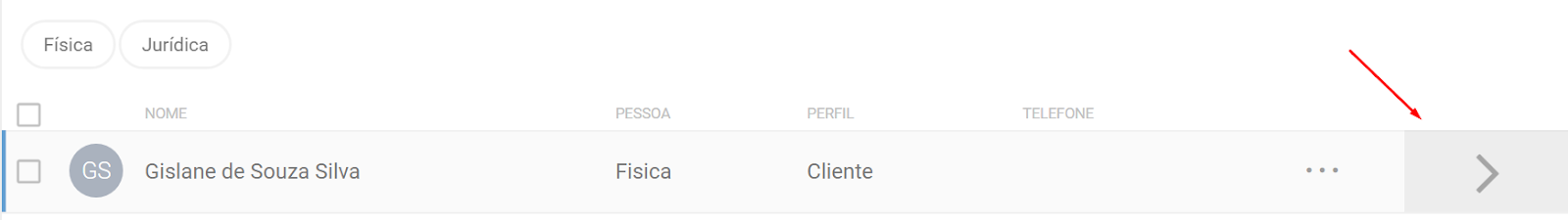 Para visualizar o(s) processo(s) no(s) qual(is) a pessoa está envolvida, vá no módulo Pessoas > Cadastros e posicione o mouse sobre o contato, por fim clique no ícone da seta