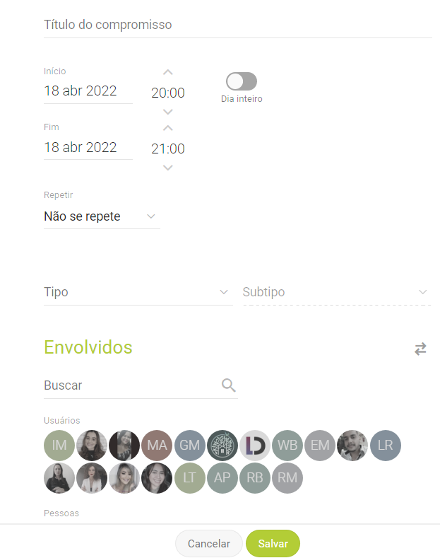 Caso não haja compromissos vinculados é possível criar um clicando em + Adicionar, então a aba de compromissos será exibida.