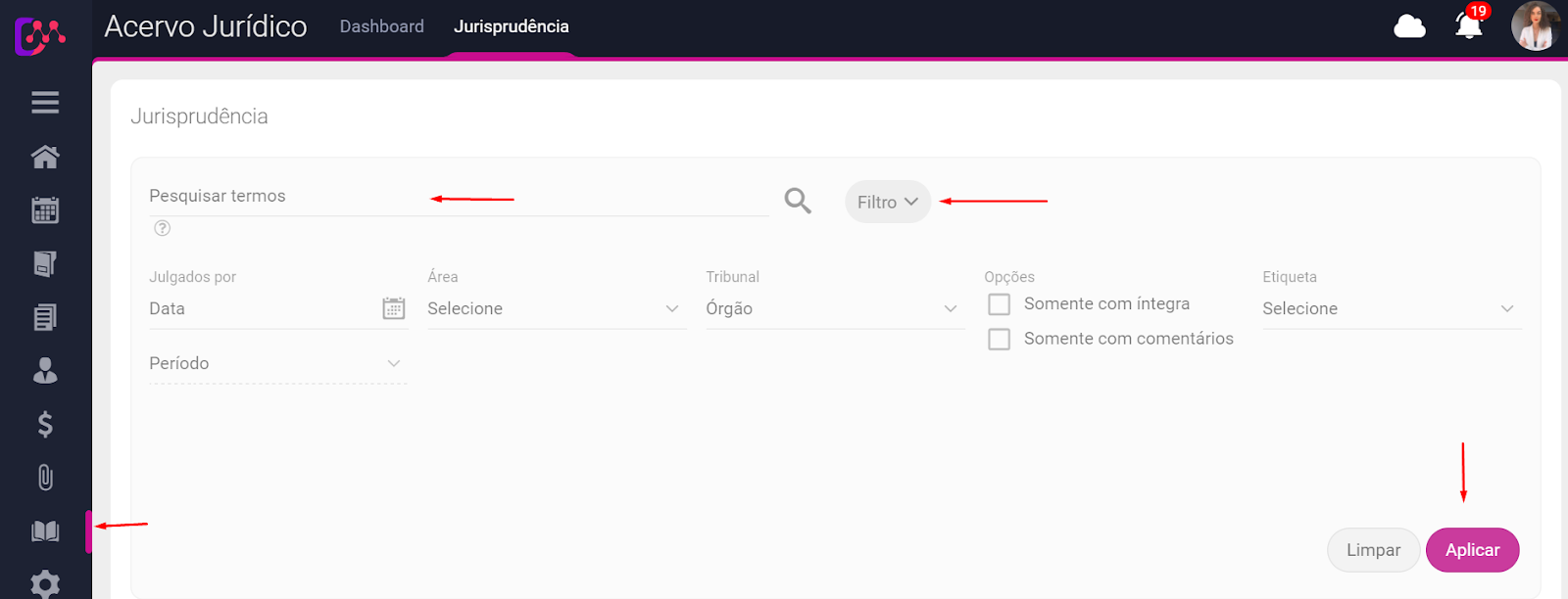 Além desta forma, para uma busca mais refinada você pode realizar filtros estabelecendo a data do julgado, área, tribunal, se é com íntegra ou não e se possui etiqueta criada.
