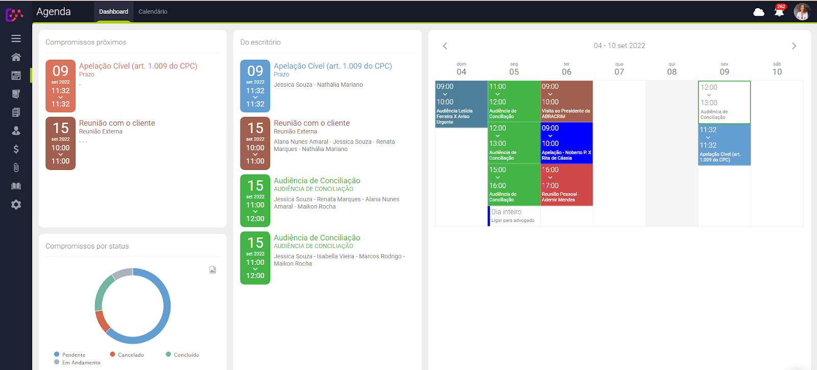 O dashboard da agenda exibe uma prévia dos seus próximos compromissos, compromissos do escritório, calendário semanal e o gráfico de compromissos categorizados por status (pendente, cancelado, concluído e em andamento).