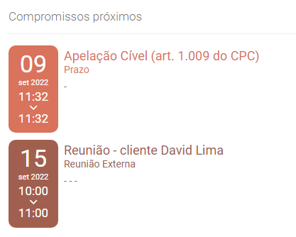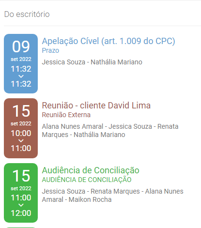 Do escritório: Nesse dashboard são informados todos os compromissos do escritório, do mês corrente, que o usuário tem permissão para acessar. São ordenados do mais recente ao mais distante.