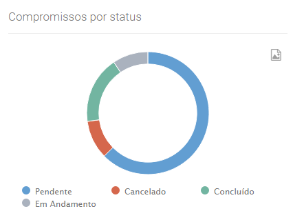 Compromissos por status: Nesse dashboard são exibidos a quantidade de compromissos do escritório, classificados de acordo com os status. E clicando no ícone da imagem, no canto superior direito, são exibidas as opções de Copiar ou Salvar a imagem do gráfico.