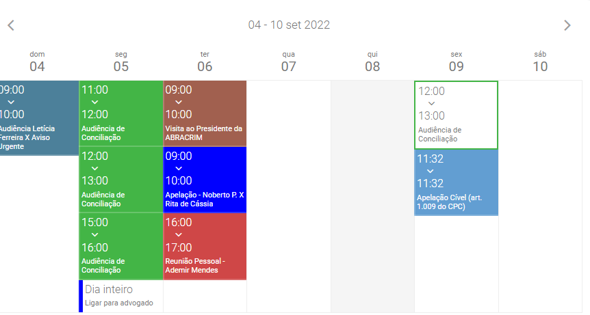 Calendário semanal: Aqui é apresentado um resumo do calendário, com todos os compromissos cadastrados na semana.