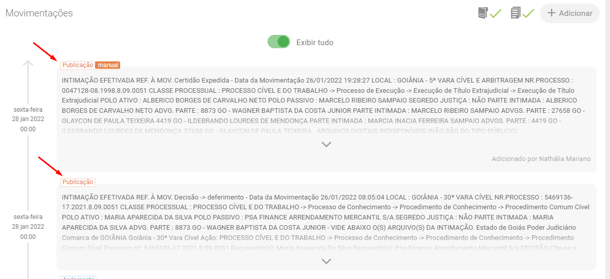 Publicações manuais são aquelas buscadas nos Diários de Justiça e painéis* que o usuário, por alguma razão, vincule à uma pasta cujo número de CNJ seja igual ou diferente.