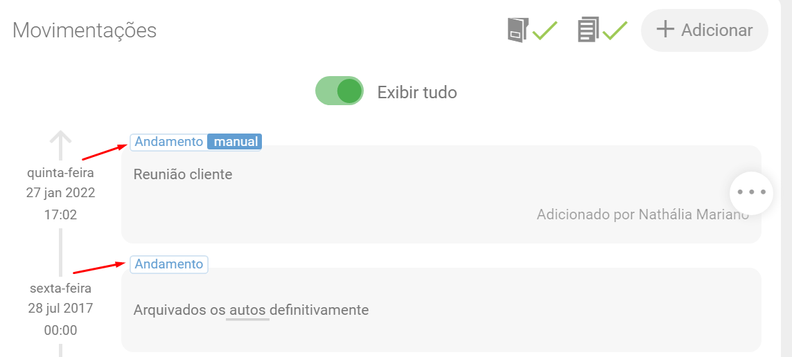Andamentos manuais são aqueles que o próprio usuário pode inserir dentro da aba Movimentações.
