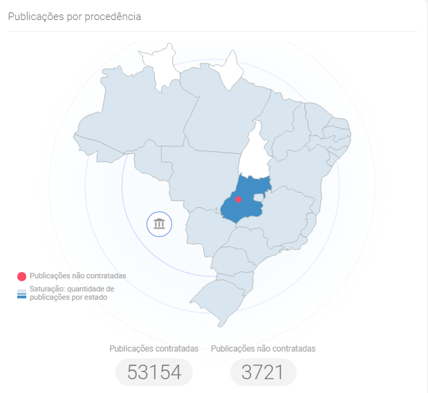 Neste dashboard é apresentado um mapa gráfico do Brasil, onde são destacados em azul os estados brasileiros em que mais foram encontradas publicações para os nomes contratados. Quanto mais intenso o tom de azul, mais publicações foram localizadas no respectivo estado.