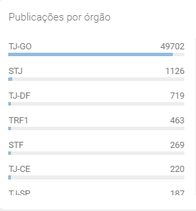 Neste dashboard é exibida a quantidade de publicações encontradas, classificadas de acordo com o órgão em que o processo está tramitando.