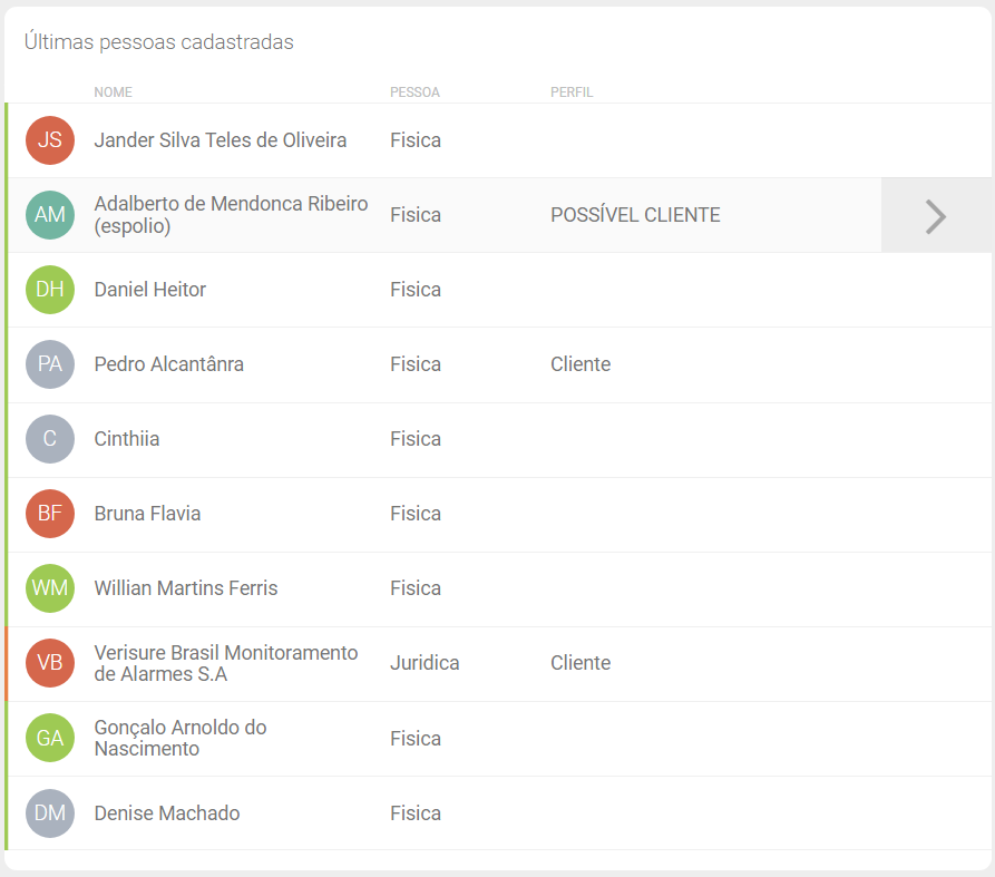 Nesse dashboard são apresentados os últimos cadastros de pessoas que foram registrados no software, na ordem dos mais recentes aos mais antigos.