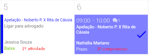 No calendário a diferença visual entre um e outro é que o compromisso tem toda a cor do quadrado preenchida, já uma atividade tem apenas uma barra de cor lateral e conforme você passar o mouse por cima da atividade a cor irá se alterar.