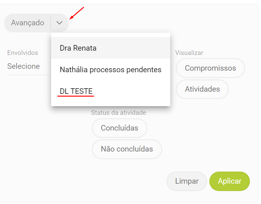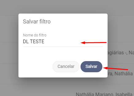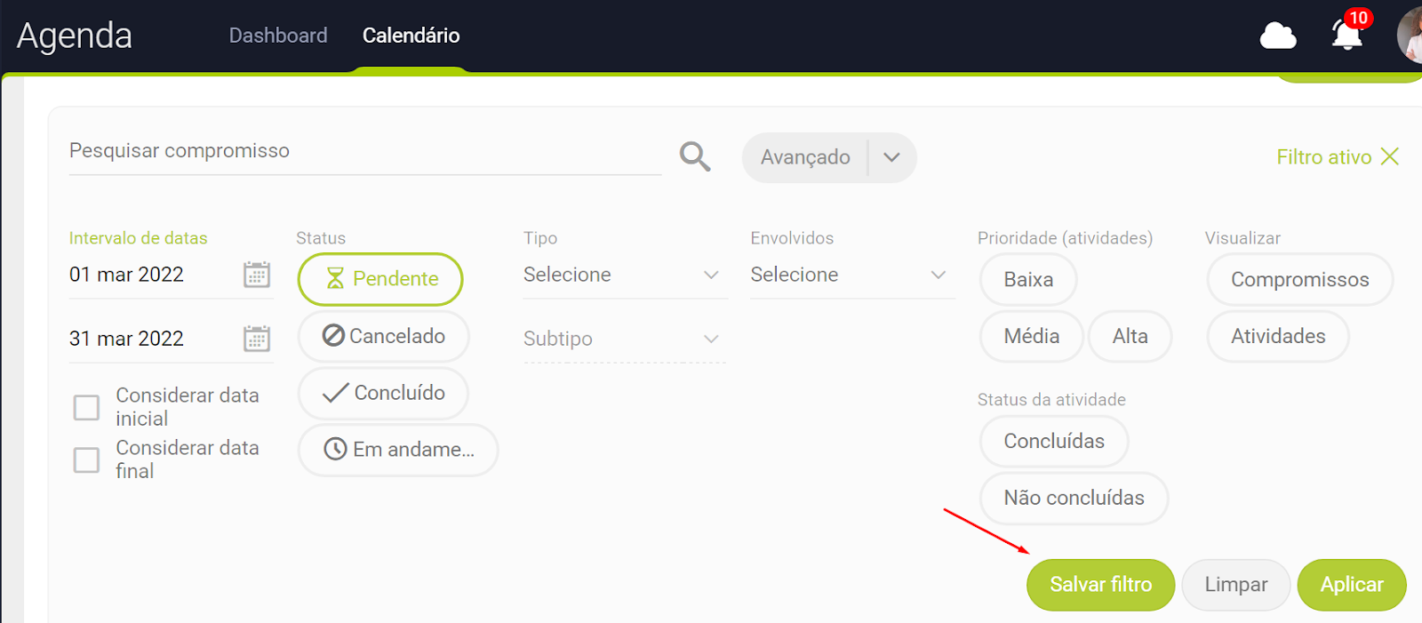 Realizei uma pesquisa de compromissos e gostaria de salvar essa pesquisa como um filtro personalizado. Como proceder? Para salvar o filtro de pesquisa criado, clique em Salvar filtro. Surgirá uma janela > escolha um nome para o filtro e clique em Salvar. O filtro que foi salvo será exibido ao clicar na setinha que fica do lado do botão Avançado: