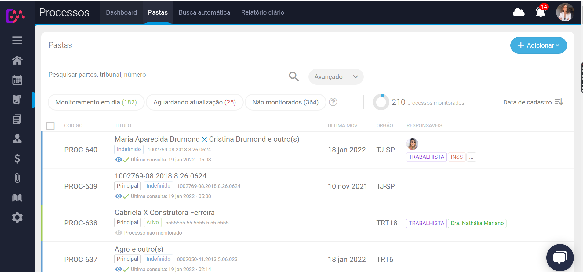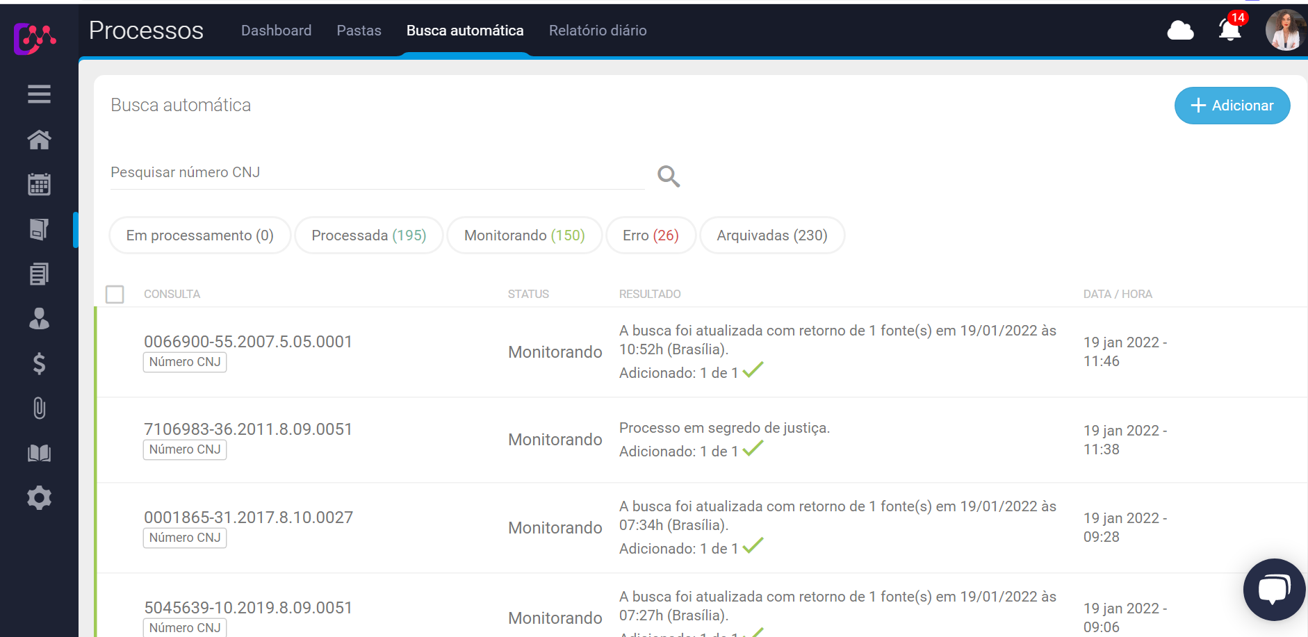 Com a ajuda da busca automática é possível cadastrar processos de forma simples e rápida, sem que seja necessário muito esforço da equipe. É a aba responsável pelas busca dos processos através do nº CNJ.