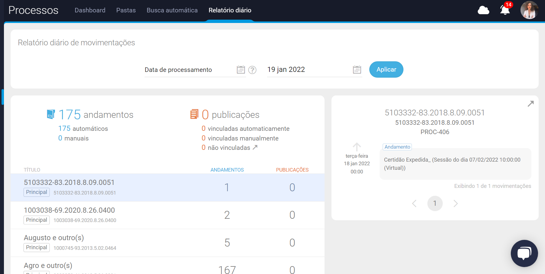 c) Relatório DiárioO relatório diário é uma ferramenta extremamente importante para o escritório pois mostra, de forma prática, todos os andamentos e publicações de um período específico. É possível fazer a consulta por data de disponibilização, processamento, remessa, vínculo e publicação.