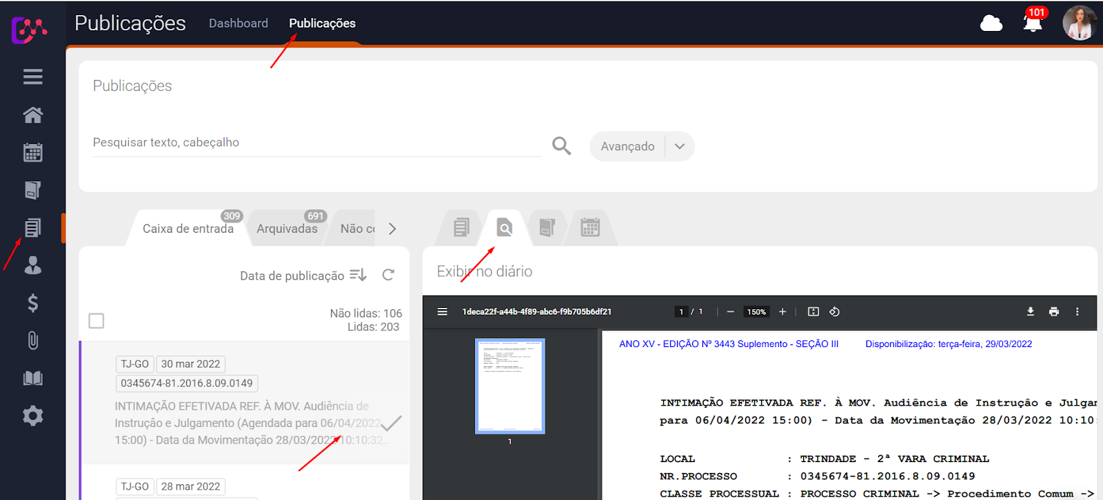 Como visualizar a página do diário que a publicação foi encontrada? Para visualizar a publicação na íntegra vá no módulo Publicações > Caixa de entrada > clique na publicação > clique no ícone > selecione o ícone da lupa .