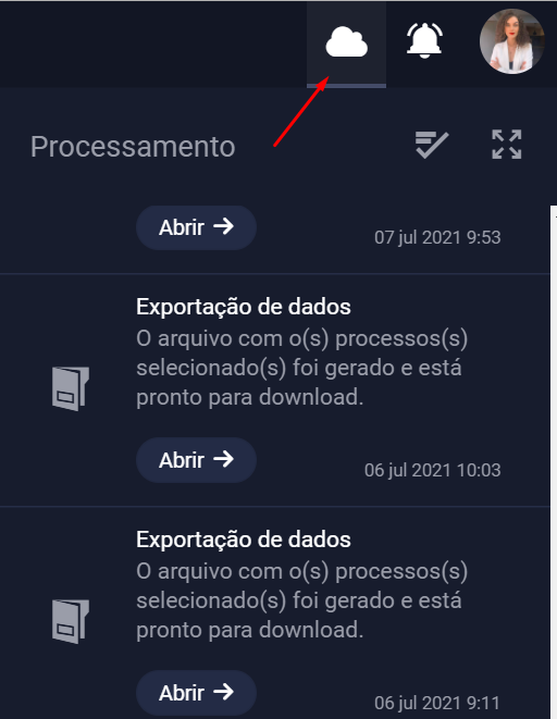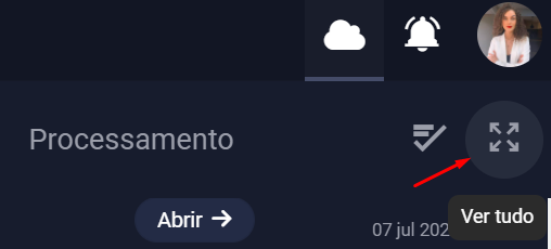 Para acessar a aba de Processamento do seu software vá na tela principal e clique no ícone da nuvem que está localizado na lateral direita da tela. Assim é possível visualizar todas as notificações de processamento e relatórios exportados.