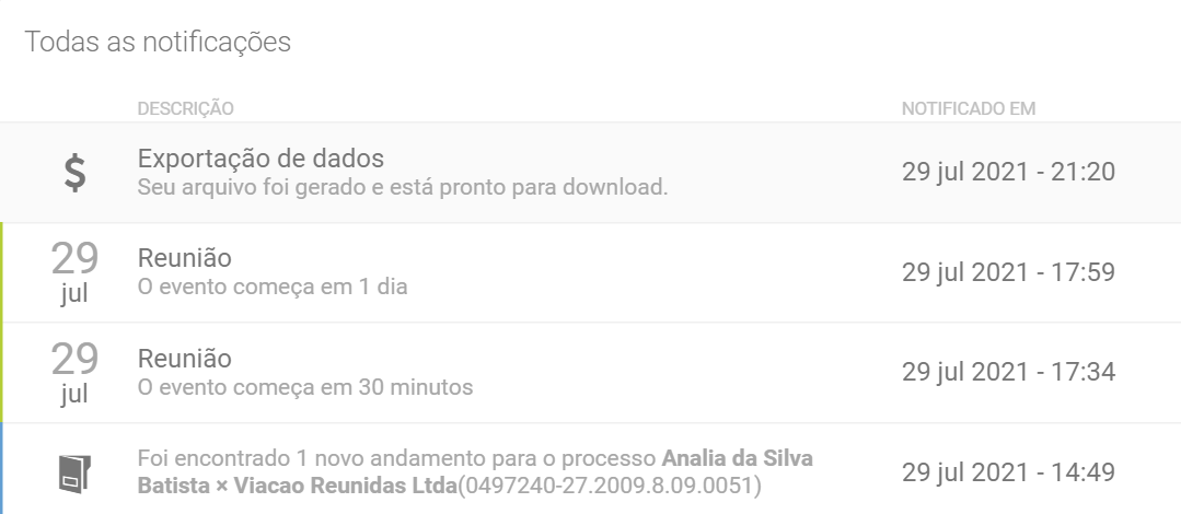 Onde será exibida uma lista com toda as notificações de processamentos, buscas e relatórios exportados pelo software.
