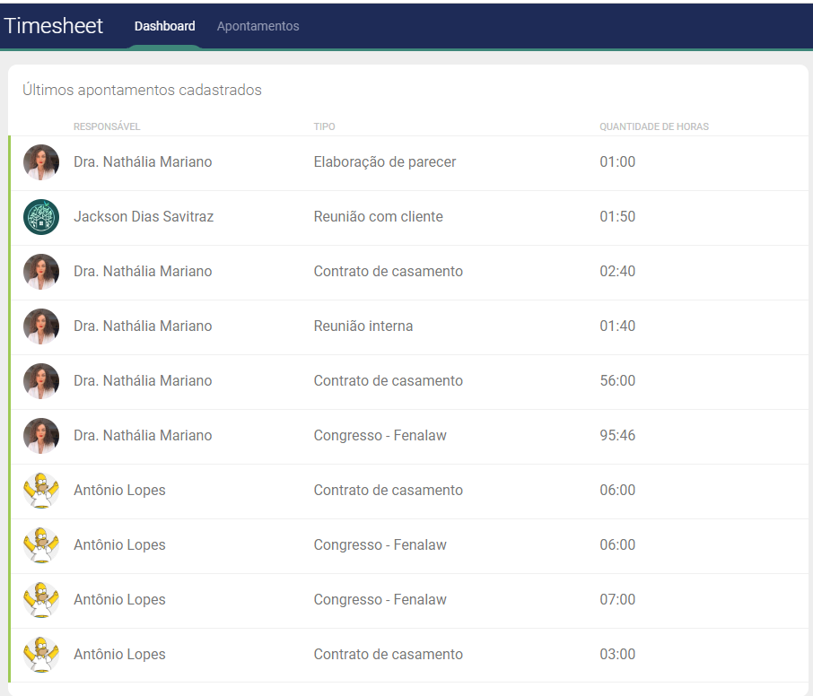 Neste card são exibidos os últimos dez apontamentos cadastrados, isso inclui o responsável pela inclusão, qual tipo foi incluído e a quantidade de horas de cada apontamento.