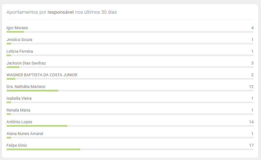 Neste card exibe o nome dos responsáveis e a quantidade de apontamentos realizados por cada um nos últimos 30 dias.