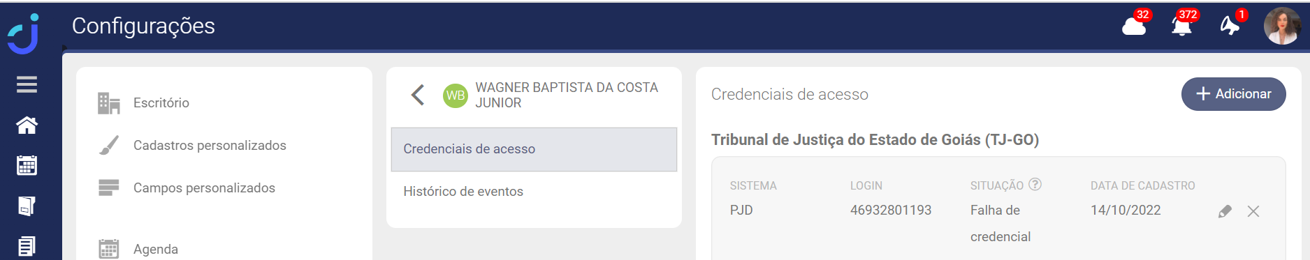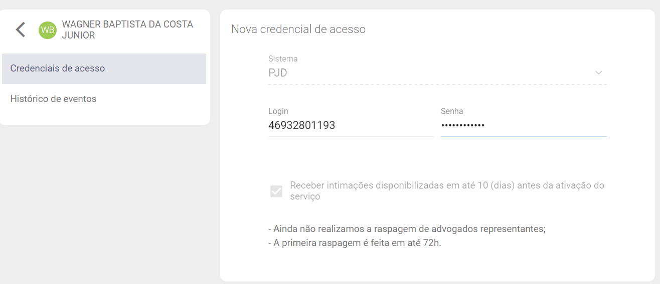 Para atualizar sua credencial de acesso e continuar com o fornecimento de forma adequada, primeiro acesse o sistema Control JUS com seu login e senha e clique em Configurações > Publicações > Nomes pesquisados > escolha um nome > Painéis > Credenciais de acesso.