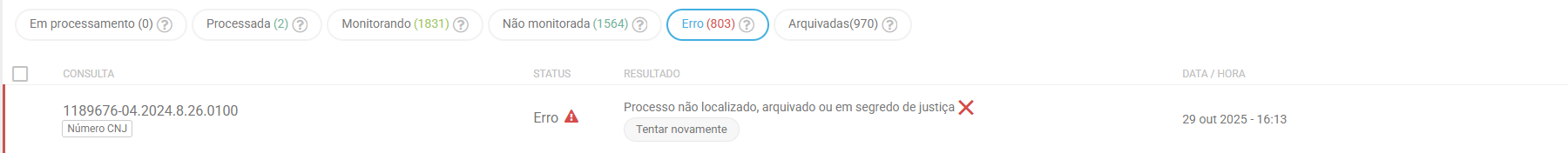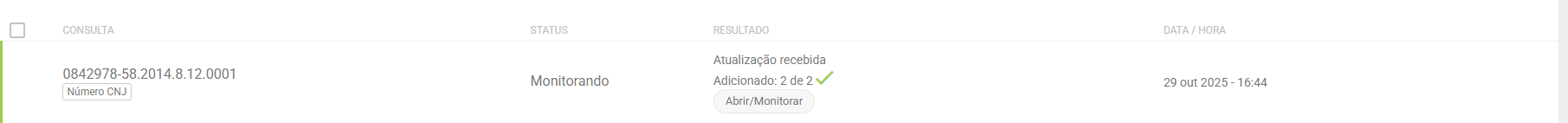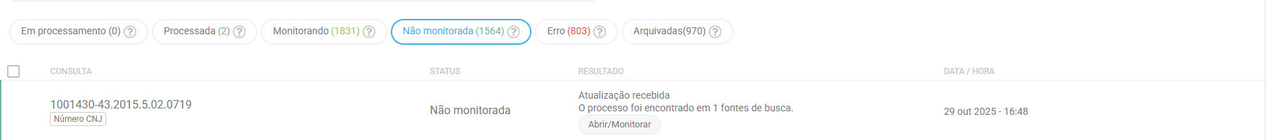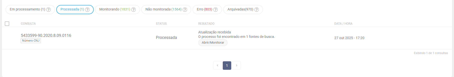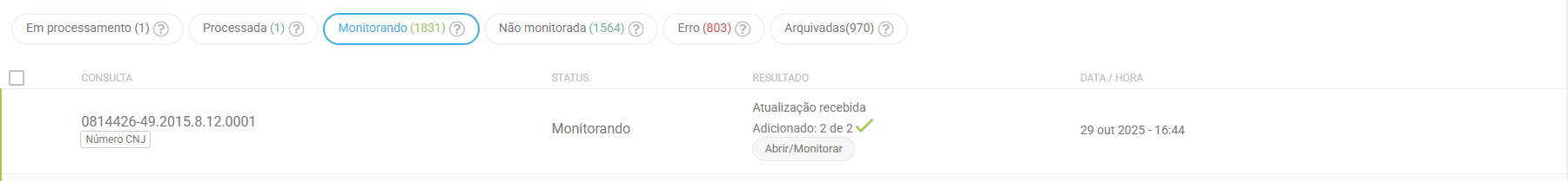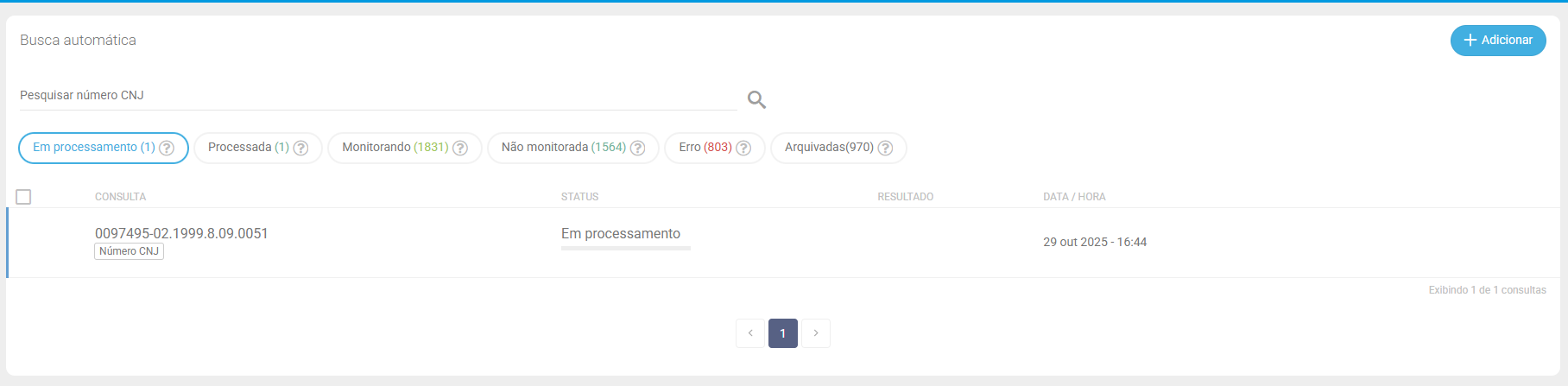 Processada significa que a busca do processo já foi realizada e encontra-se disponível para ser adicionado à pasta com ou sem monitoramento. Essa é a imagem que aparece quando está processada: