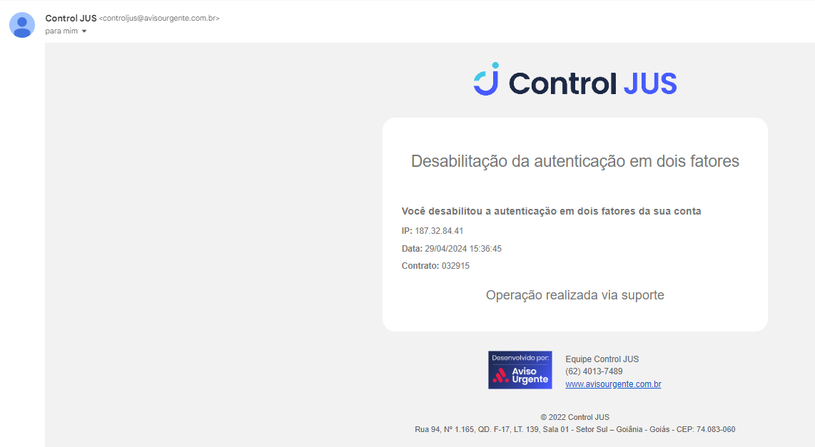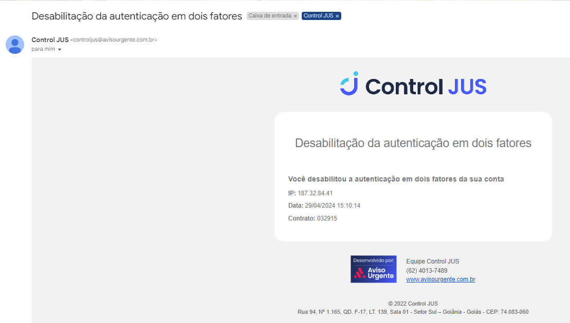 Quando você habilita ou desabilita a autenticação em dois fatores você recebe um e-mail avisando da ação realizada, veja o layout do e-mail: