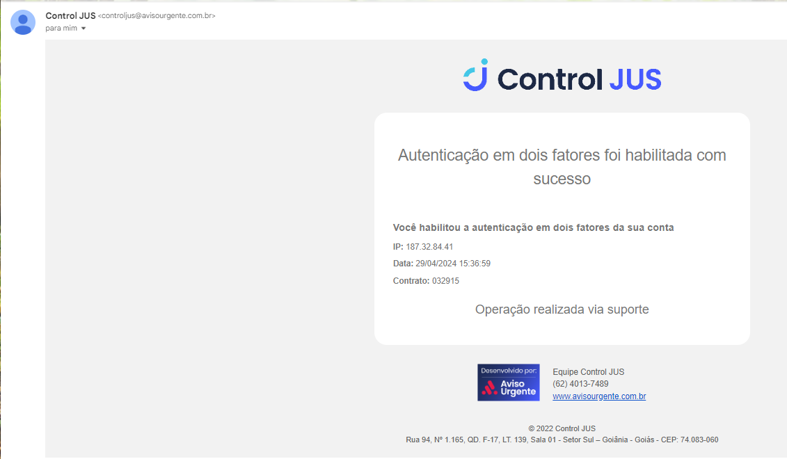 Observação: O e-mail deverá ser disparado do mesmo utlizado para se autenticar no Control JUS.
