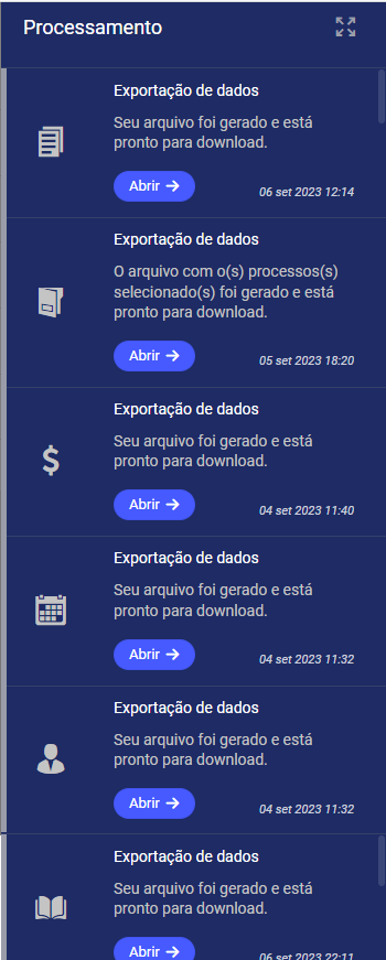 - Notificação de relatórios/documentos exportados dos módulos: Agenda, Processos, Publicações, Pessoas, Financeiro, GED e Configurações.